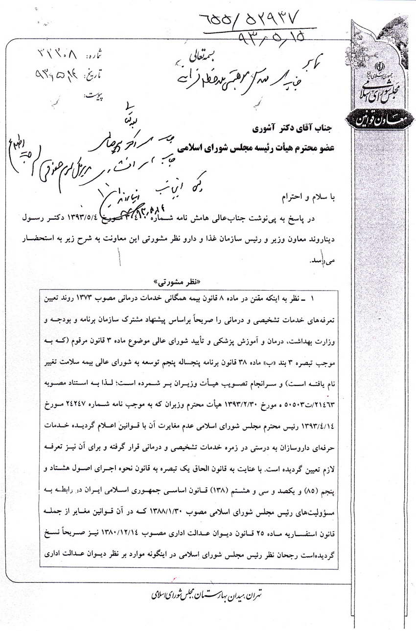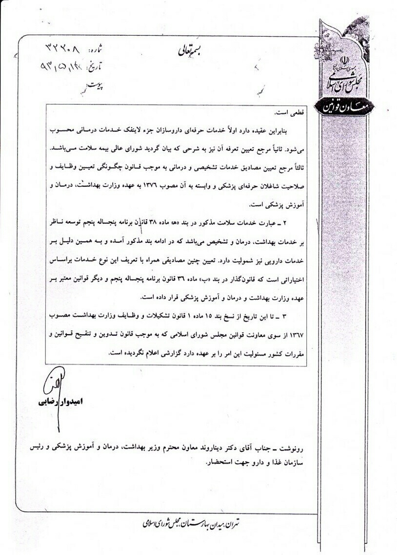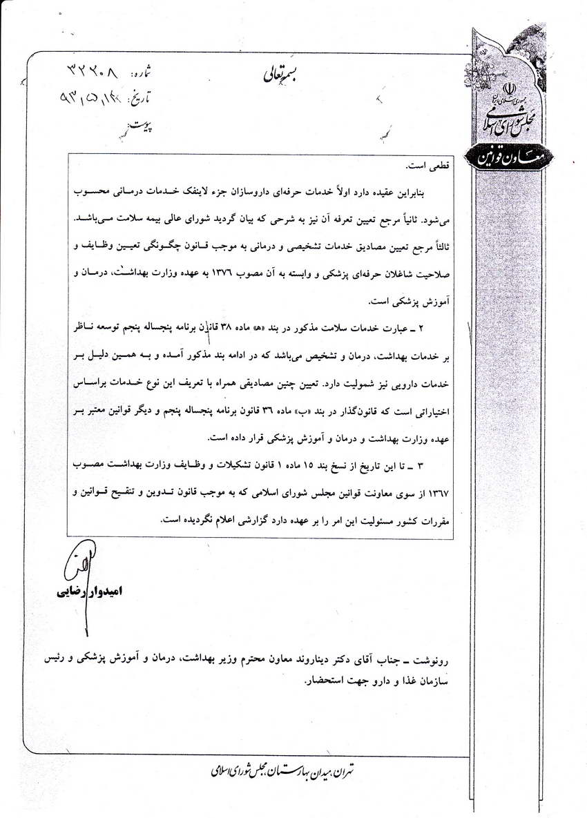 ریاست محترم کمیسیون بهداشت و درمان مجلس شورای اسالمی جهت استحضار