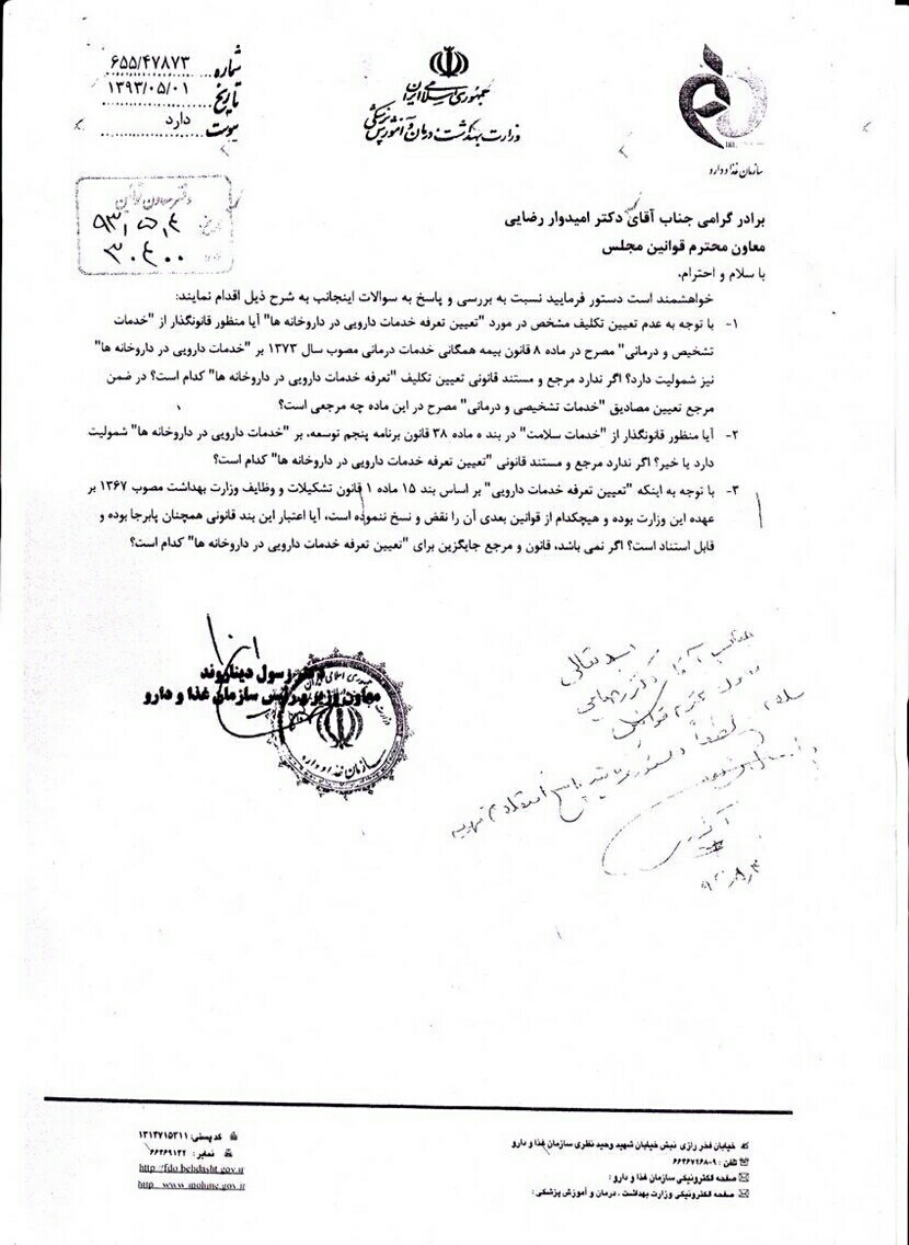 بر اساس بند51 ماده 5 قانون تشکیالت و وظایف بهداشت و درمان و آموزش پزشکی مصوب سال 5631 مجلس شورای اسالمی، تعیین مبانی محاسبه هزینه های تشخیصی و درمانی و دارویی و نیز تعیین تعرفه های مربوطه در بخش دولتی و خصوصی جزو وظایف وزارت بهداشت بوده و رای دیوان عدالت اداری مبنی بر لغو حق فنی داروخانه ها -که هر ساله توسط وزارت بهداشت اعالم می گردد- قانونی نبوده و خود بسی جای تامل دارد.