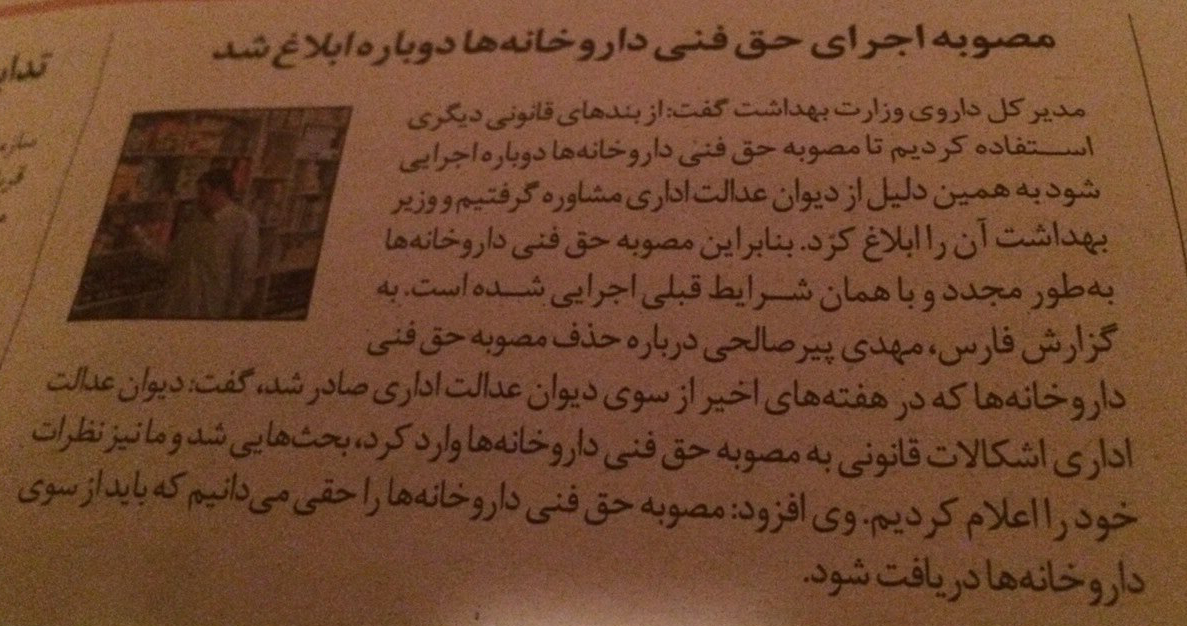اما در ایران با وجود تورم حداقل 25% ، سود داروها بین 15-7% بالاتر نمی رود که این امر امنیت مالی و روانی این گروه زحمتکش و متخصص را بسیار به خطر می اندازد.این حق فنی یا حق مسئولیت علمی که با نام جهانی Professional fee یا Dispensive fee شناخته می شود .