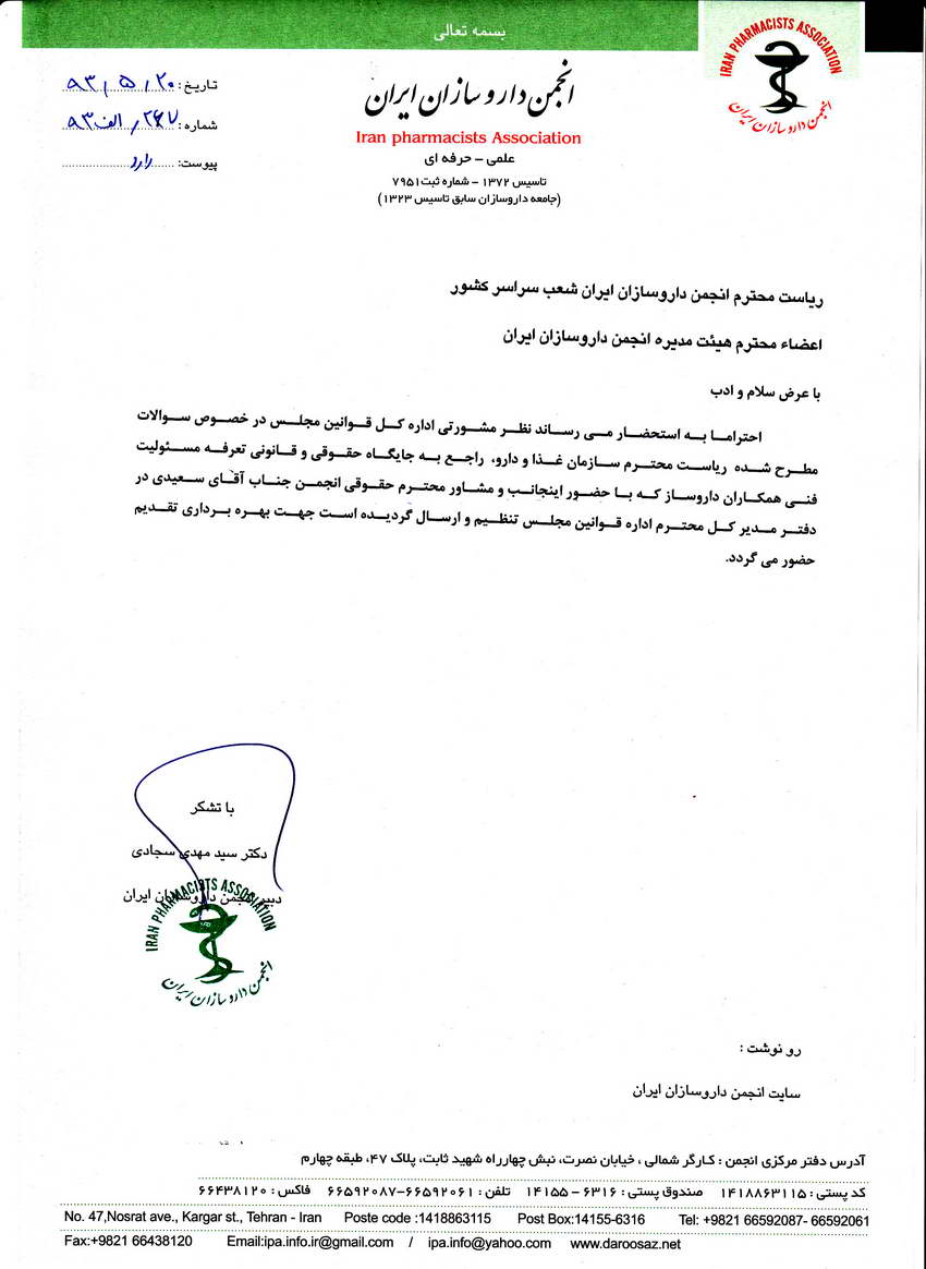 ریاست محترم انجمن داروسازان ایران جهت استحضار و پیگیری